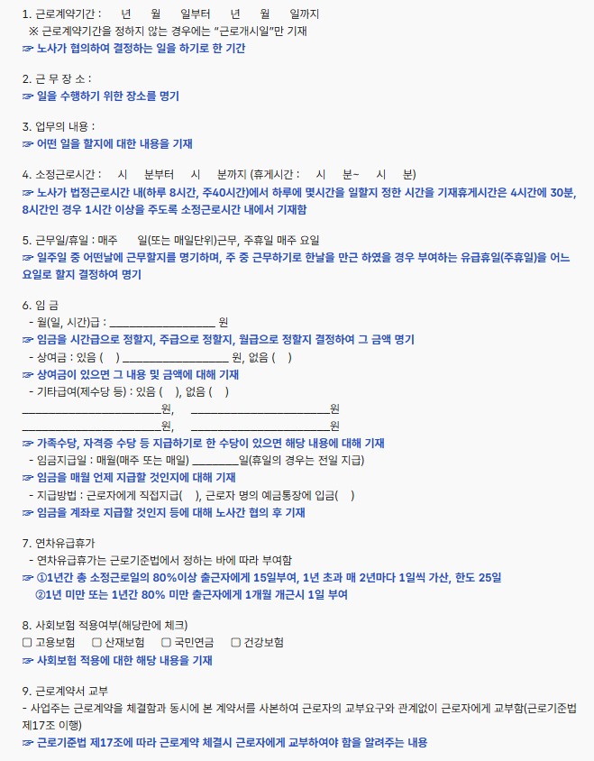 알바도 근로계약서를 꼭 써야 할까요? 해당 내용에 대해 설명 드리겠습니다.✔ 근로계약서 미작성 할 경우?단기 근로자라도근로계약서를 작성하고,근로자에게 교부하지 않을 경우500만원 이하의 과태료처분을 받을 수 있습니다.정규직 근로자의 근로계약서 미작성은형사 처분 대상이 됩니다.근로자와 사업주 모두의권리보호를 위해 반드시 작성해야 합니다.※ 법에 미달되는 조건으로 계약을 체결할 경우,해당 조건은 무효가 되고, 근로기준법이 정한 기준이 적용 됩니다. 다만, 근로계약 자체가 무효화 되지는 않습니다. ✔ 근로계약서 필수 기재 사항1.소정근로시간법정근로시간 내(하루 8시간, 주 40시간)에서 하루 몇 시간 일할지를 뜻합니다. 미리 정한 출퇴근 시간을 적는 것이며, 4시간 근무시 휴게시간 30분, 8시간 이상..